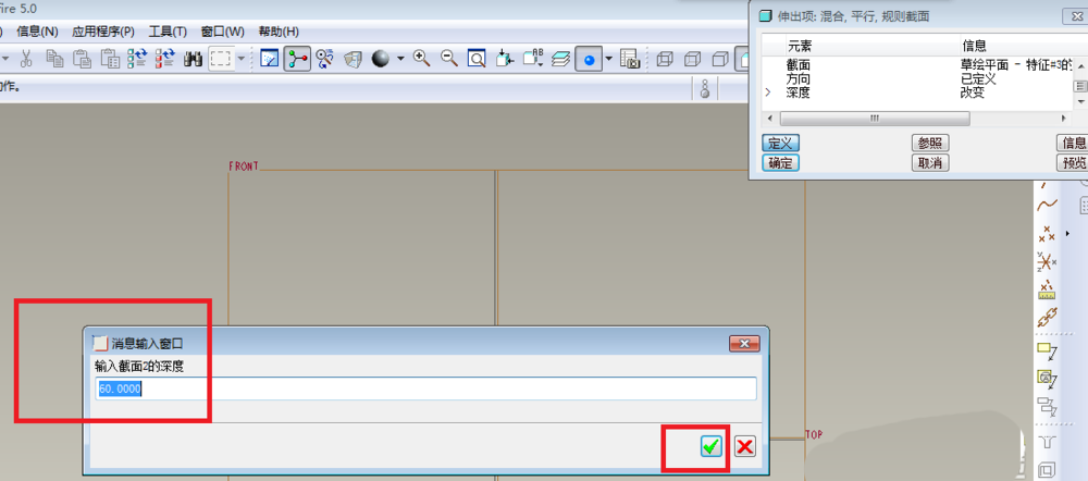 11、如下图所示,出现一个“消息输入窗口”,要求输入截面深度,笔者选择了输入60,然后点√。