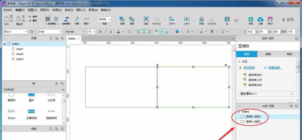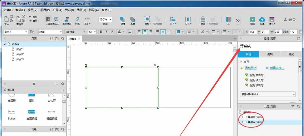 6、新增几个元件,可以在右侧“大纲。页面”看到已命名的元件,以元件的名称来显示;