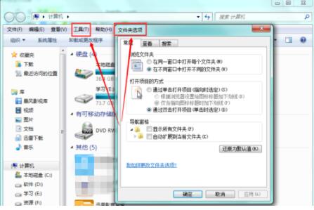 打开【我的电脑】(计算机),点击【工具】,在下拉菜单中点击【文件夹选项】,