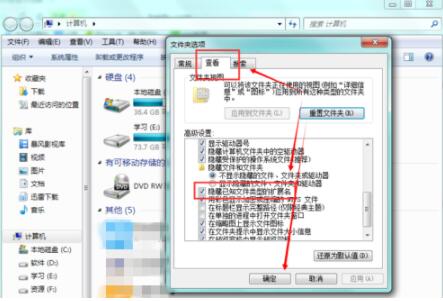 然后点击【查看】,将鼠标向下滑,找到【隐藏已知文件的文件扩展名】选项,取消勾选,点击确定。