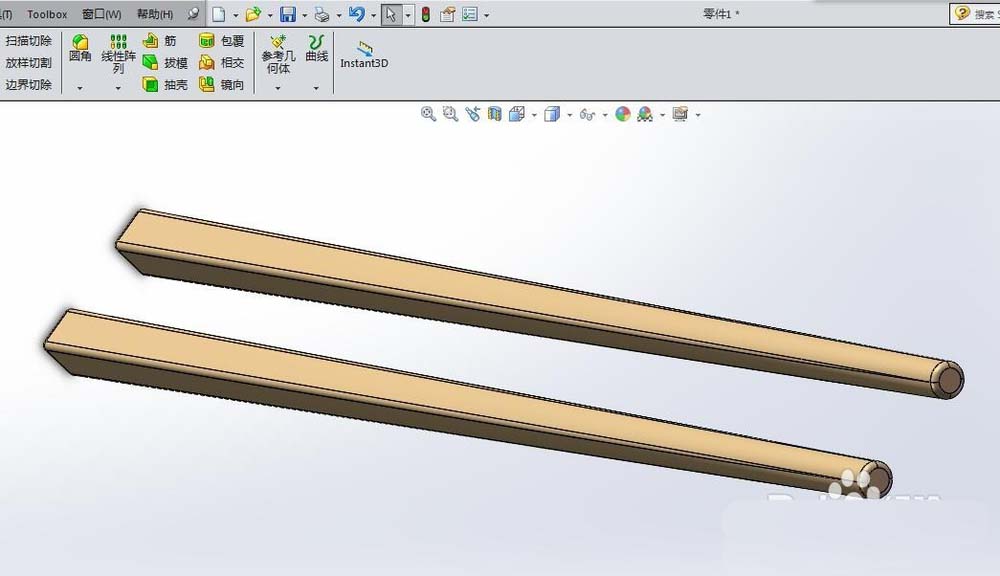 12、如下图所示,一双云杉筷子就在SolidWorks中造出来了。