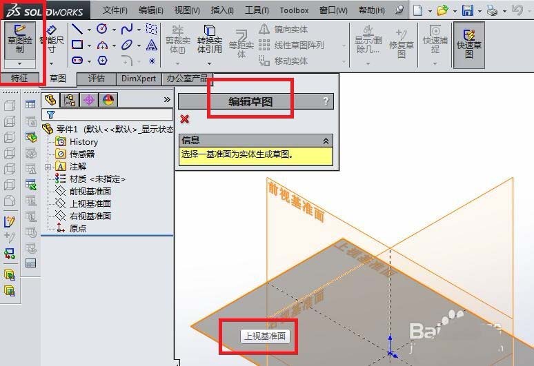 2、如下图所示,首先点击工具栏中的“草图绘制”图标,然后一个“编辑草图”对话框和三个基准面,笔者选择“上视基准面”作为草图平面。