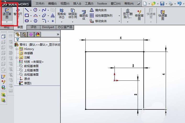 3、如下图所示,首先点击工具栏中的“矩形”图标,然后在草图区域画一个矩形,然后点击工具栏中的“智能尺寸”图标,照着下图所示标注尺寸,要求矩形(4x4正方形)中心点与坐标原点重合,最后“退出草图”。