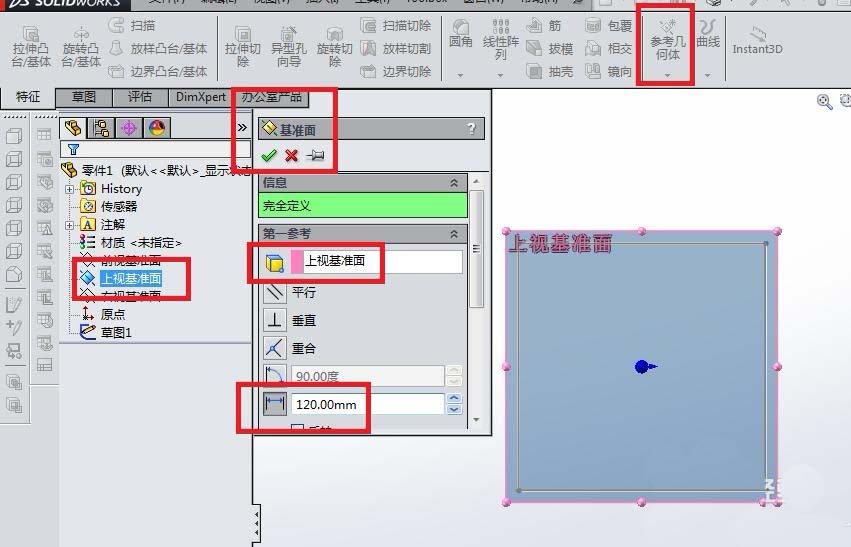 4、如下图所示,首先点击工具栏中的“参考几何体”下方的三角图标,然后在其展开的下拉菜单中点击“基准面”,在弹出“基准面”对话框之后,点击设计树中的“上视基准面”作为第一参考,设置距离为120,然后打√。