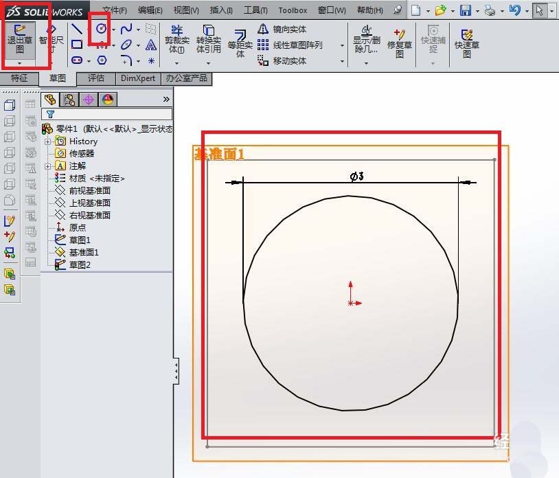 5、如下图所示,首先选中刚刚新建的基准面,然后在工具栏中点击“草图绘制”就直接进入到草图状态,然后点击工具栏中的“圆”图标,然后以坐标原点为圆心画一个圆,然后点击工具栏中的“智能尺寸”标注圆的直径3,然后“退出草图”。