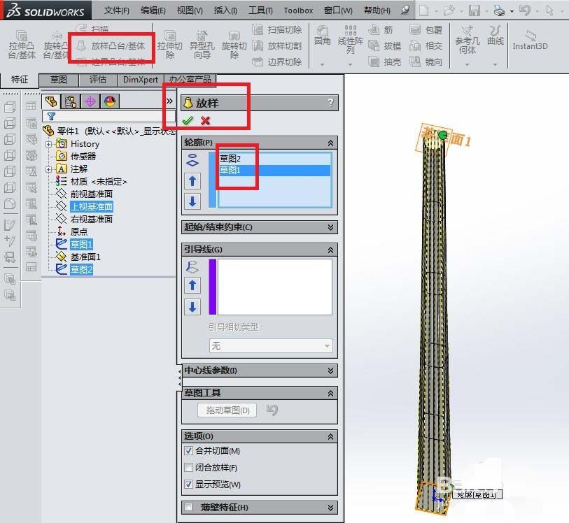 6、如下图所示,首先点击工具栏中的“放样凸台/基体”图标,然后出现“放样”对话框,然后在对话框中轮廓一栏选择矩形草图和圆形草图,然后打√。
