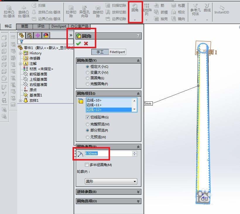 7、如下图所示,首先点击工具栏中的“圆角”图标,然后出现圆角对话框,然后对话框中圆角项目一栏选中所有边线,圆角参数一栏选择0.5就够了,最后打√。完成以上所有步骤,至此,一根筷子算是造好了。