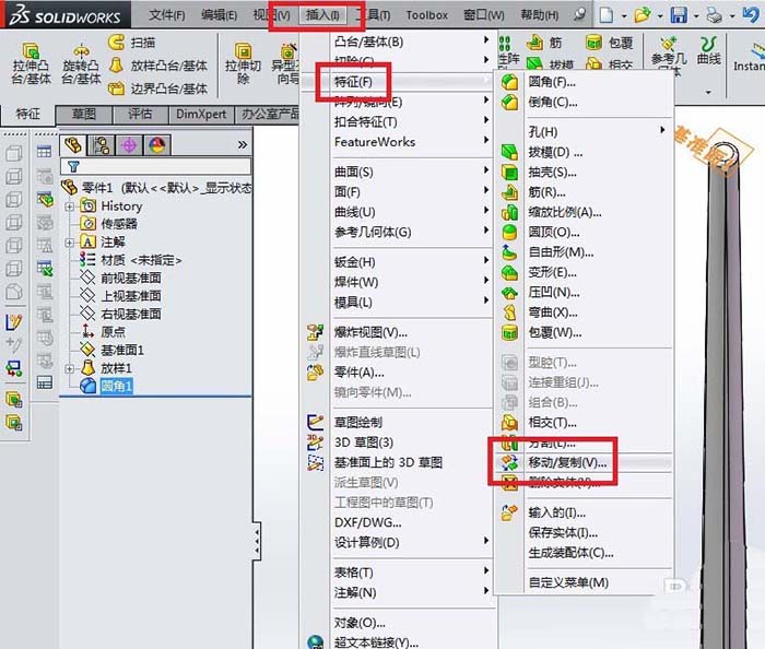 8、如下图所示,首先点击标题栏中的“插入”,然后在其展开的下拉菜单中点击“特征”,再在“特征”的下拉菜单中点击“移动/复制”。