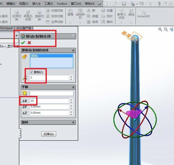 9、如下图所示,弹出一个“移动/复制实体”对话框,要移动/复制的实体一栏在三维区域选择这个零件所有实体,不要去设计树中选择,否则不成功,然后勾选“复制”,设定复制数量为1,平移一栏△x改为10,最后点击对话框左上角的√。