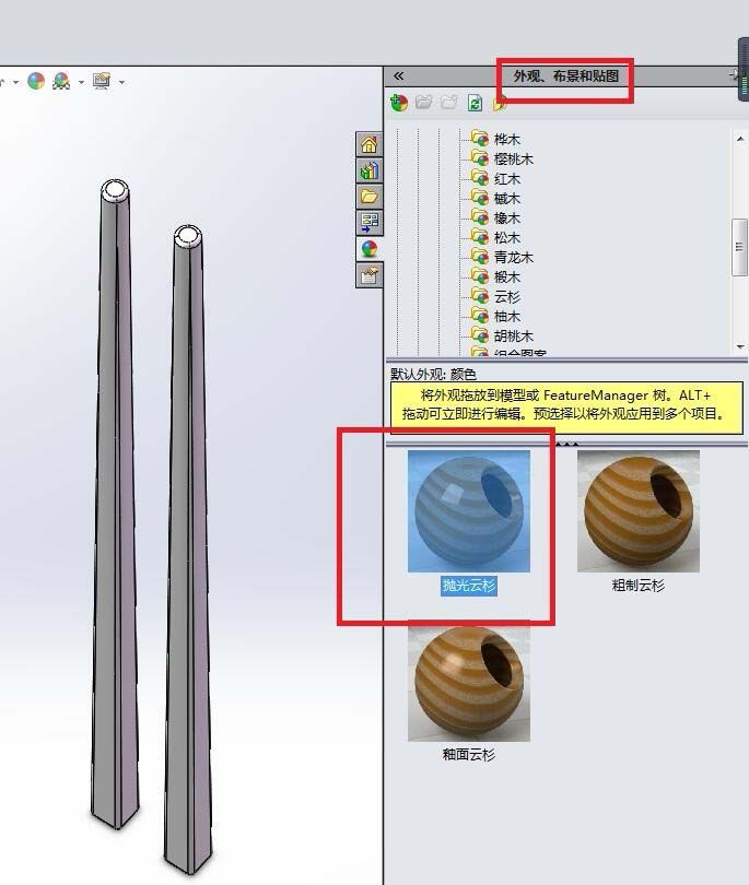 10、如下图所示,一根筷子变成了一双筷子,然后点击软件右边的“外观”图标,在弹出的素材库中选择一款我们喜欢的颜色,笔者选择了“抛光云杉”。