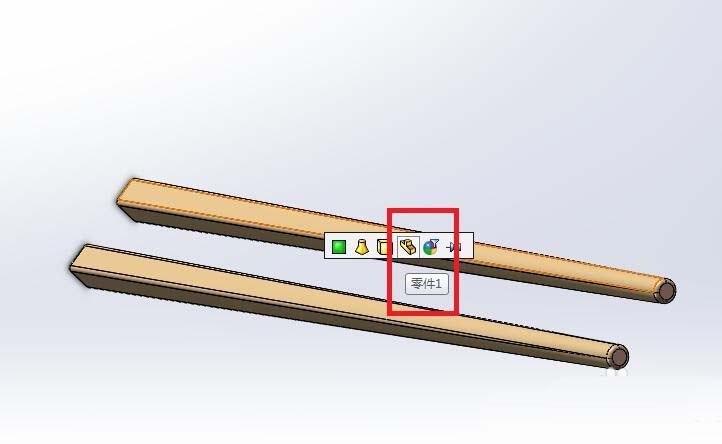 11、如下图所示,用鼠标左键将“抛光云杉”拖动到那一双筷子上再松开,然后在随之弹出的工具栏中点击整个零件的图标,(如果文件没有保存,则默认的是“零件”,如果保存了,则选择保存的“文件名”)