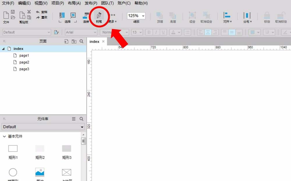 1、在Axure软件中,选择工具栏中的“钢笔工具”。