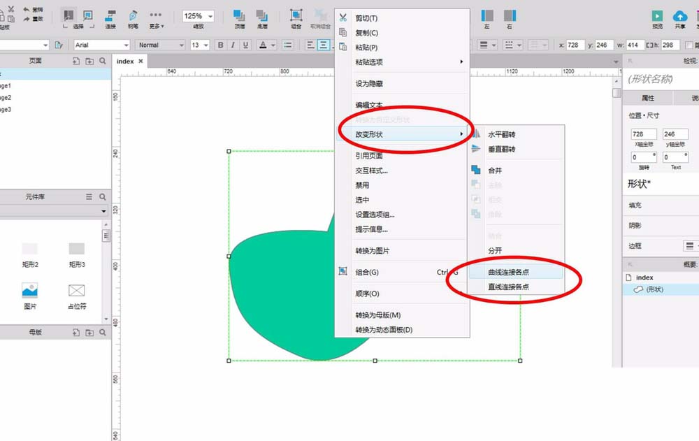 8、如果想要图形的所有尖角都变成圆角,那么只需要对准图形点击右键,在弹出的菜单中选择“改变形状”,再选择“曲线连接各点”即可获得一个圆润的图形。