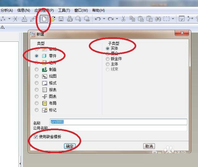 1、如下图所示,打开Pro/e5.0软件,新建一个空白的实体零件模型,勾选“使用缺省模板”。