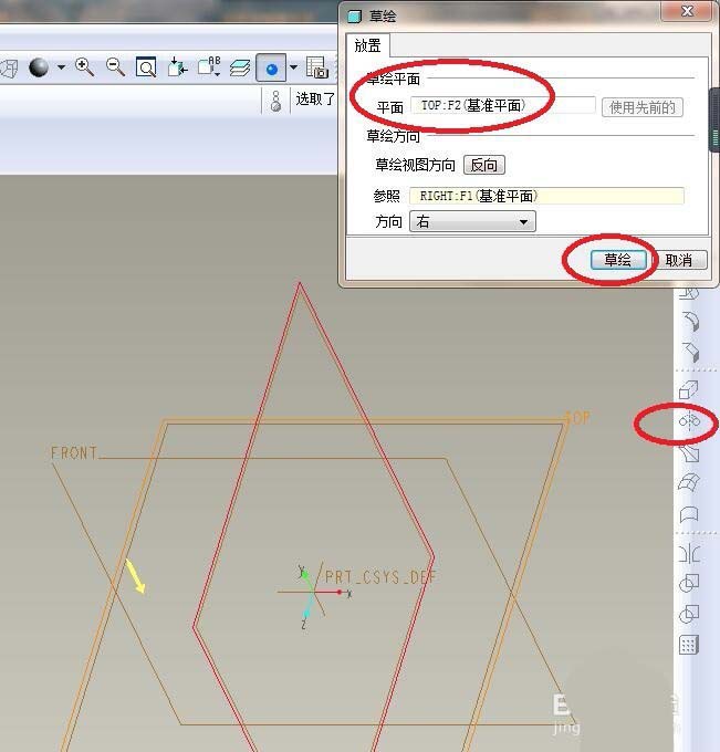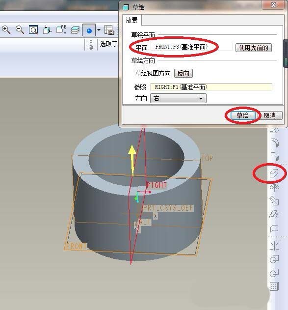 首先如下第一幅图所示,执行【拉伸——放置——定义——FRONT面——草绘】。