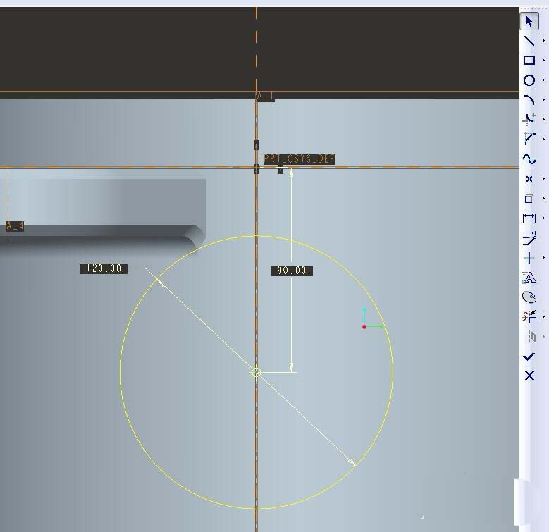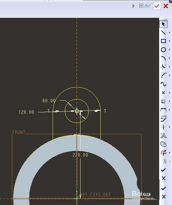 然后如下第二幅图所示,进入到草绘环境,点击右边工具箱中的“圆”图标,在草绘区域纵轴上画一个圆,点击右边工具箱中的“标注”,按照下图尺寸进行标注约束,点击右边工具箱中的√,完成并退出草绘。