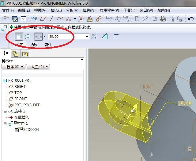 然后如下第三幅图所示,退出草绘环境之后,在软件左上角调整拉伸方向,设置拉伸距离30,在软件右上角点√,完成拉伸操作。