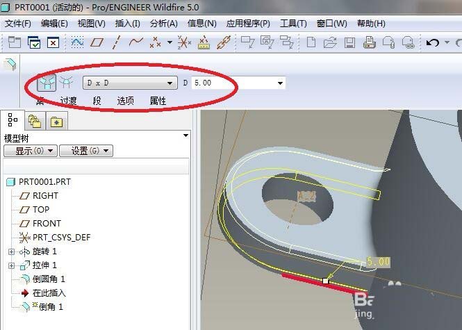 然后如下第二幅图所示,点击右边工具箱中的“边倒角”图标,软件左上角设置倒角方式尺寸为5x5,在实体中选择两个要倒角的边线,软件右上角点击√,完成边倒角操作。