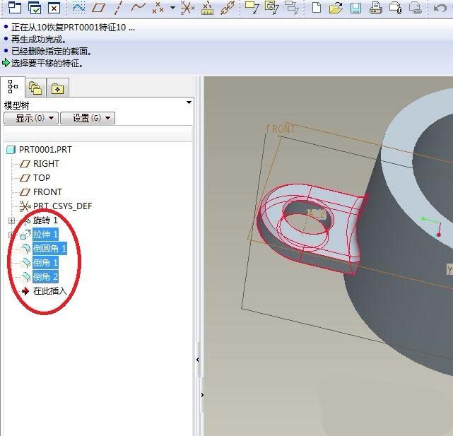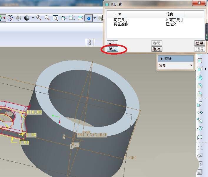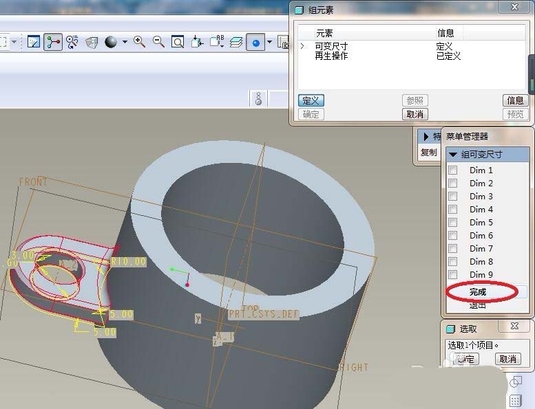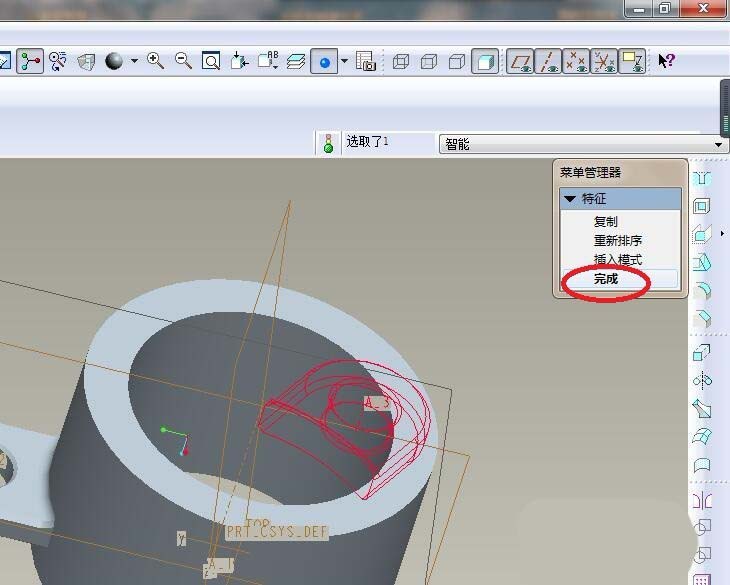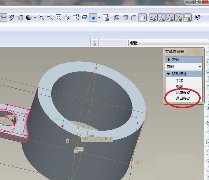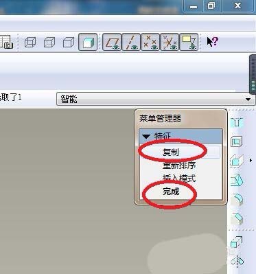 13、如下图所示,这个特征旋转移动成功了,菜单管理器回到了最开始的状态,我们可以点击“完成”。也可以继续点击“复制”,开始第二次的特征操作。