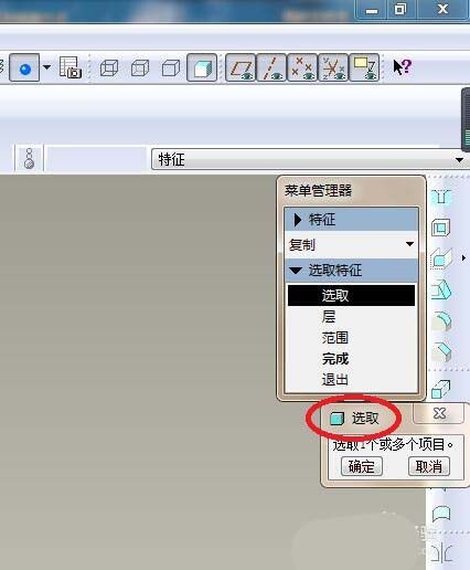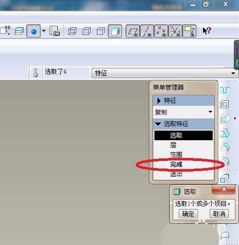 8、事先如下第一幅图所示,根据菜单管理器的操作提示:选取1个或多个项目。然后如下第二幅图所示,我们在设计树中选中这四个操作。然后如下第三幅图所示,我们在菜单管理器中点击“完成”。