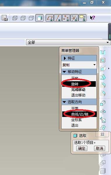 10、如下图所示,首先我们选择了实体中零件主体的旋转轴,然后点击菜单管理器中的“正向”。