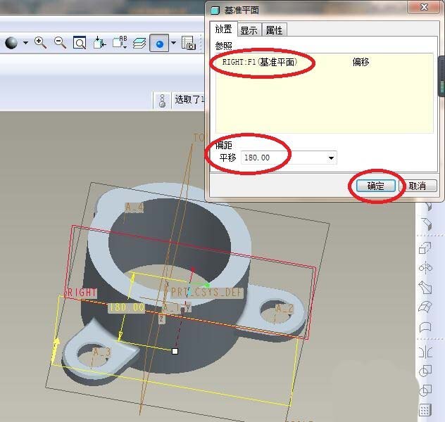 15、如下图所示,首先点击工具栏中的“平面”图标,然后“基准平面”对话框中的参照一栏选择“RIGHT面”,然后平移180,调整方向,点击“确定”。