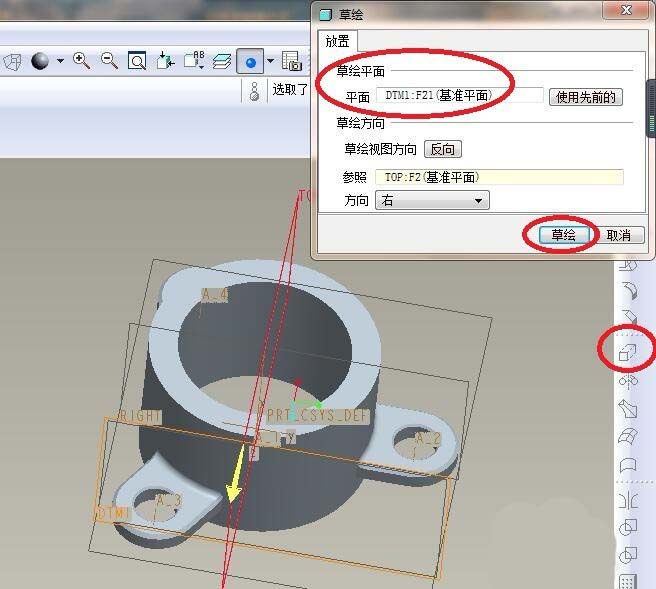 首先如下第一幅图所示,执行【拉伸——放置——定义——DTM1面——草绘】。