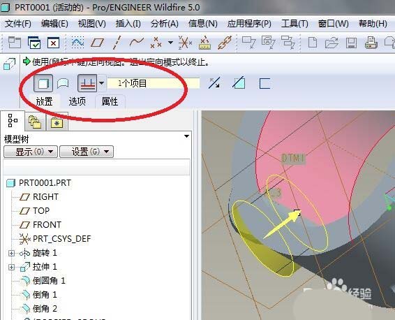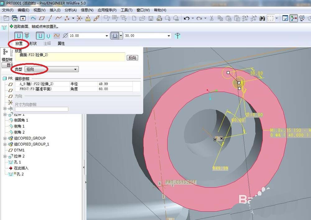 首先如下第一幅图所示,点击右边工具箱中的“孔”图标,软件左上角点击“放置”,类型改成“径向”,在实体中点击红色表面,中心轴线,设置角度60,半径49.99(本来是想设置成50的,不小心移动了一下,孔心的位置),在软件右上角点击√,完成简单孔的创建。