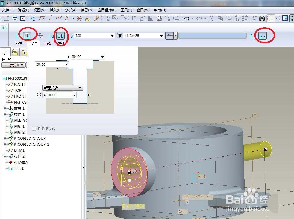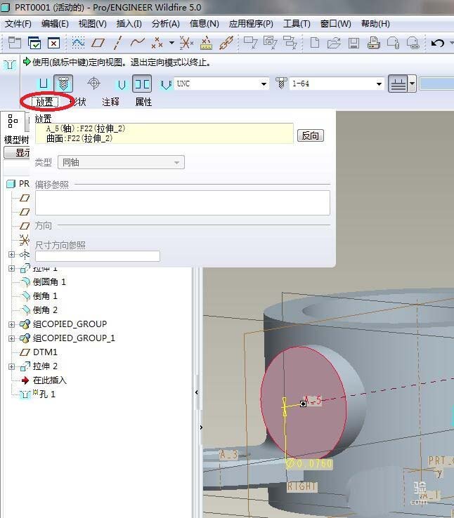 首先如下第一幅图所示,点击右边工具箱中的“孔”图标,软件左上角设置“放置”参数:实体中的红色平面,中心轴。