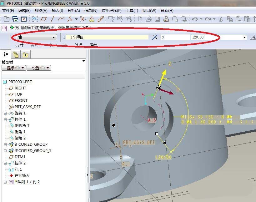 首先选中刚刚创建的孔,然后点击右边工具箱中的“阵列”图标,然后软件左上角设置阵列方式为:轴,然后选中下图中的阵列轴,然后设置阵列数量为:3,然后设置阵列角度为:120°,然后软件右上角√,完成轴阵列的操作。