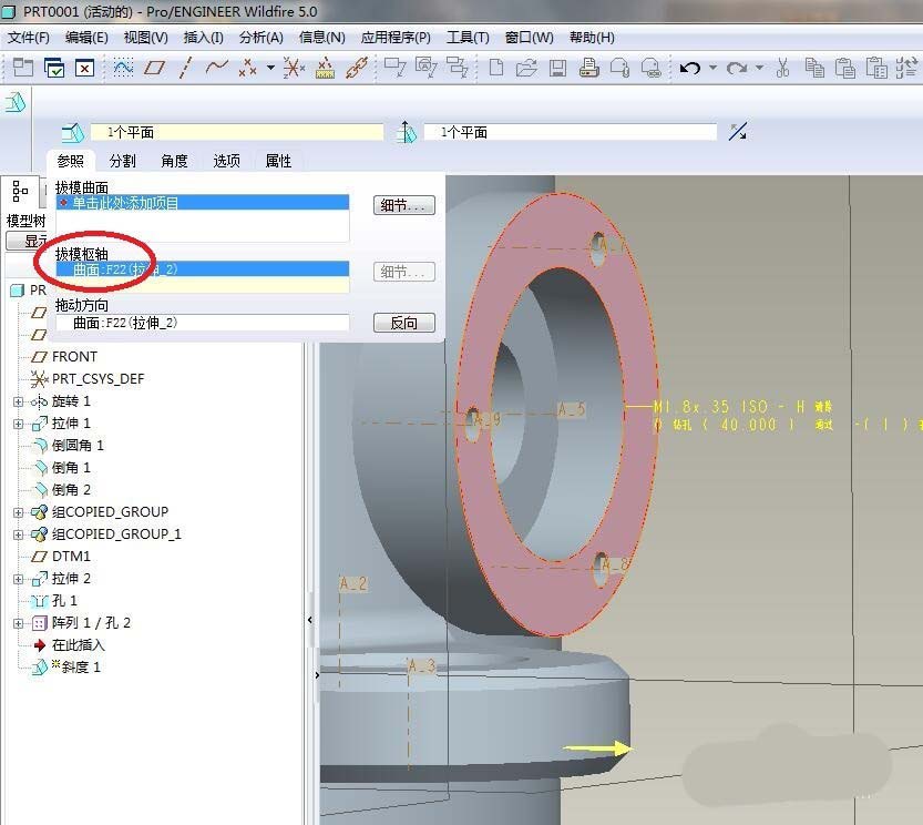 然后如下第二幅图所示,在参照中点击“拔模曲面”一栏,在实体中选择圆柱的侧面(红色曲面),