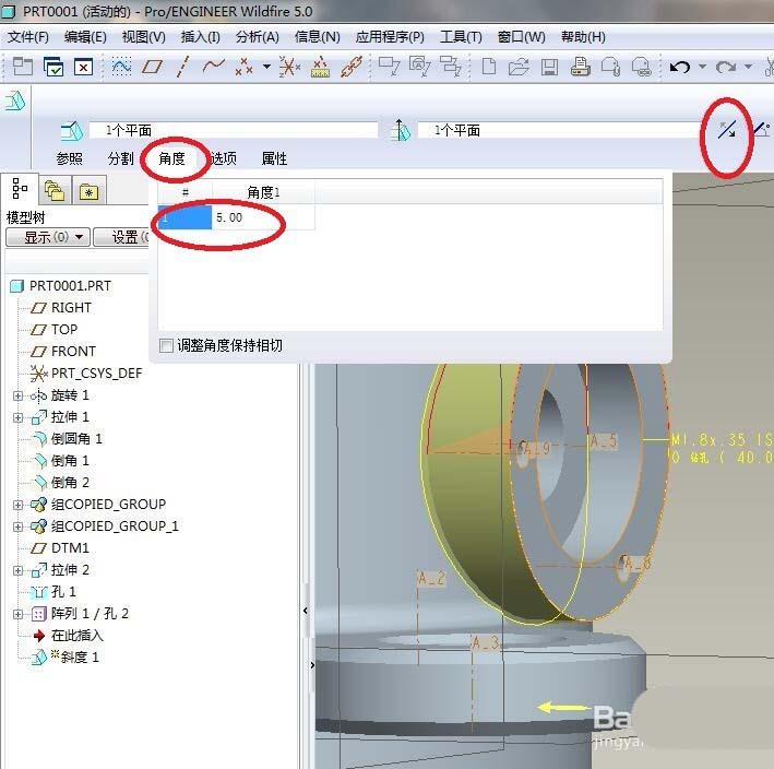 然后如下第三幅图所示,调整方向,向外张开,点击“角度”,输入5°,软件右上角点击√,完成拔模操作。