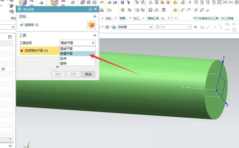 4、拆分体的平面,可以选择已有的平面也可选择新建平面。