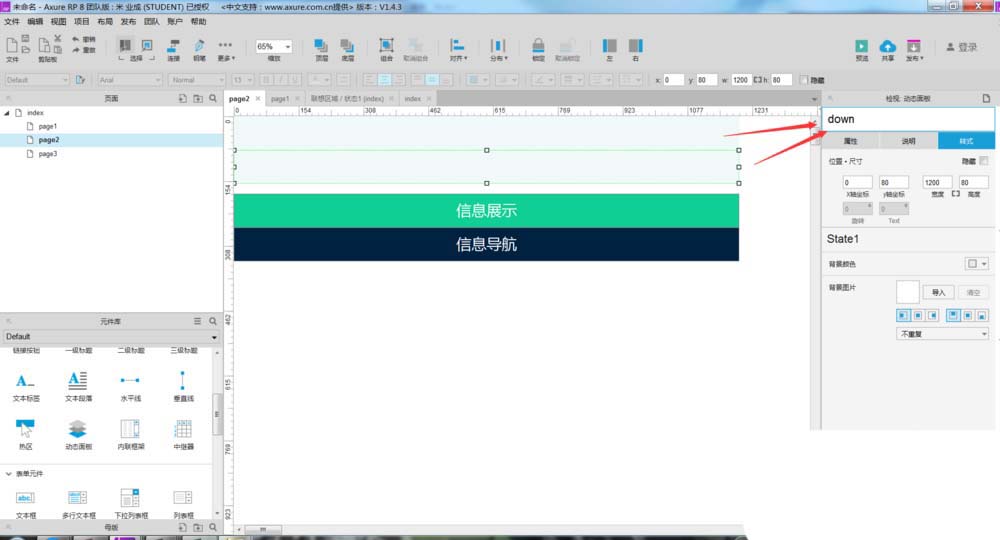 3、这一步需要对两个动态面板的名称进行设置,一个是上面的信息展示,一个是下面的导航信息,如下图所示。命名没有要求,想叫什么都可以。