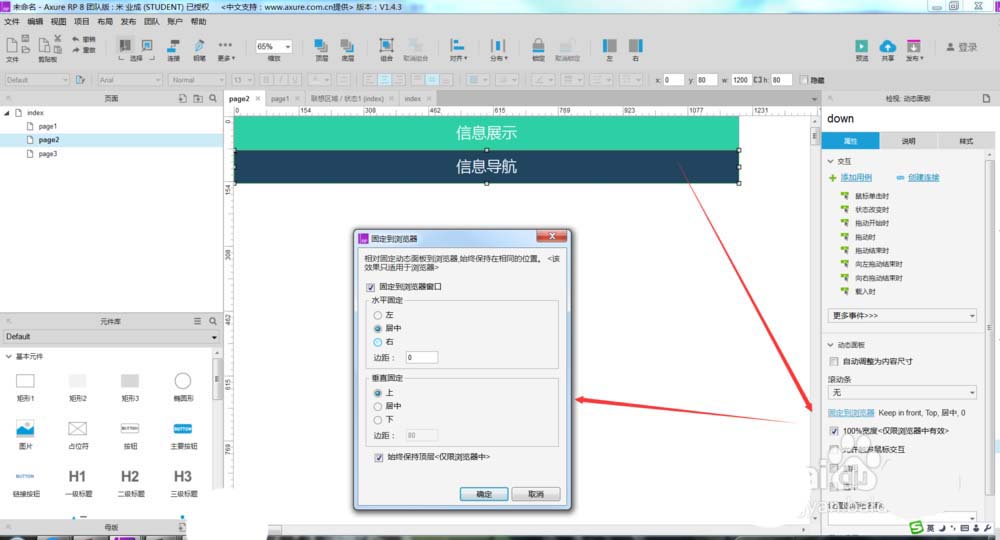 5、下面一步需要将两个动态面板的固定到浏览器这一项进行设置,水平要固定到居中位置,垂直要在上,如下图所示。