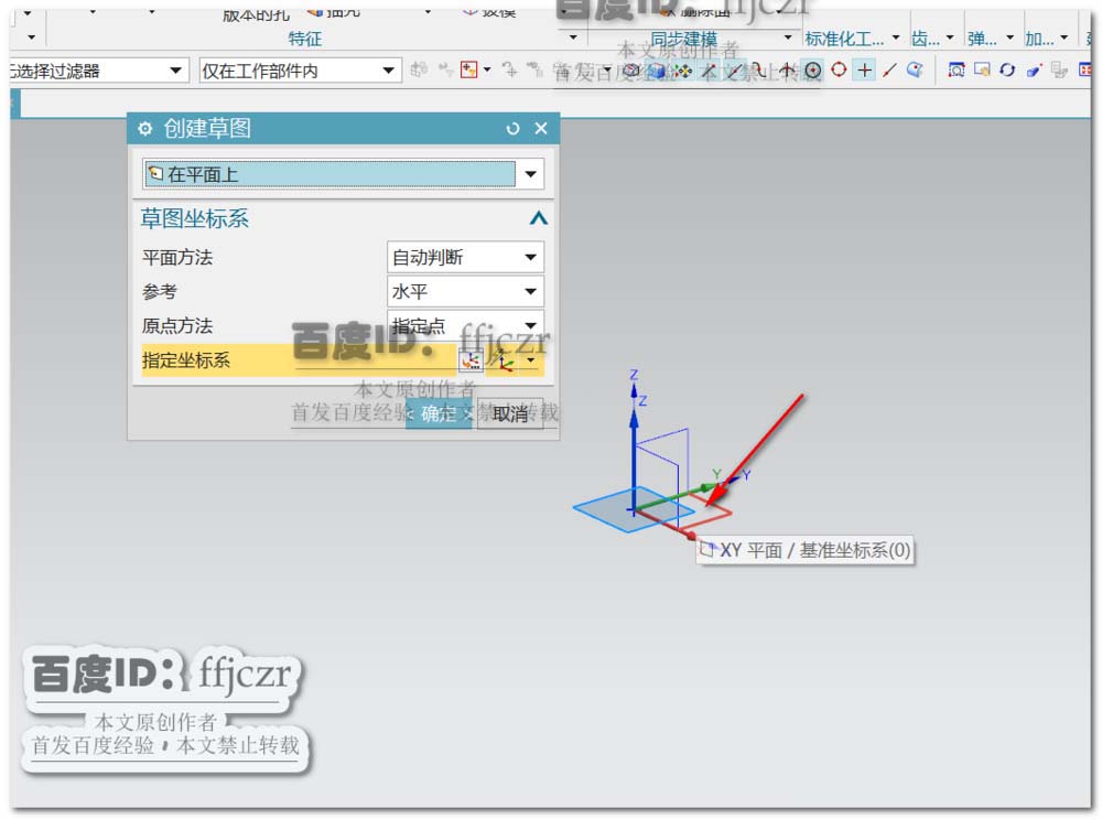 6、创建草图,以YZ面为草绘平面;在草绘中,选用相交曲线命令,将上步得到的两部分模型在本草绘中求得两组相交线。并将相交线转为参考线,选用轮廓线命令,经过下方的圆心绘水平线;经过上方箭头所示的直线中点绘竖直线,在两线相交处倒半径为20的圆角。