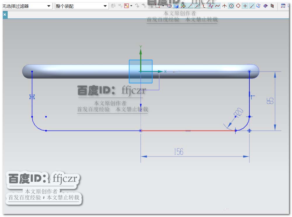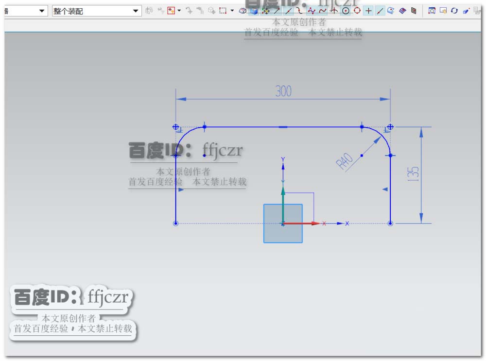 1、创建草图, 以XY面作为草绘平面,在草绘中用轮廓线命令,绘出如图所示的轮廓线;其中线的两端点在X轴上,且对称于Y轴;两点间距为300,高为135,两边倒角相等,半径为40.