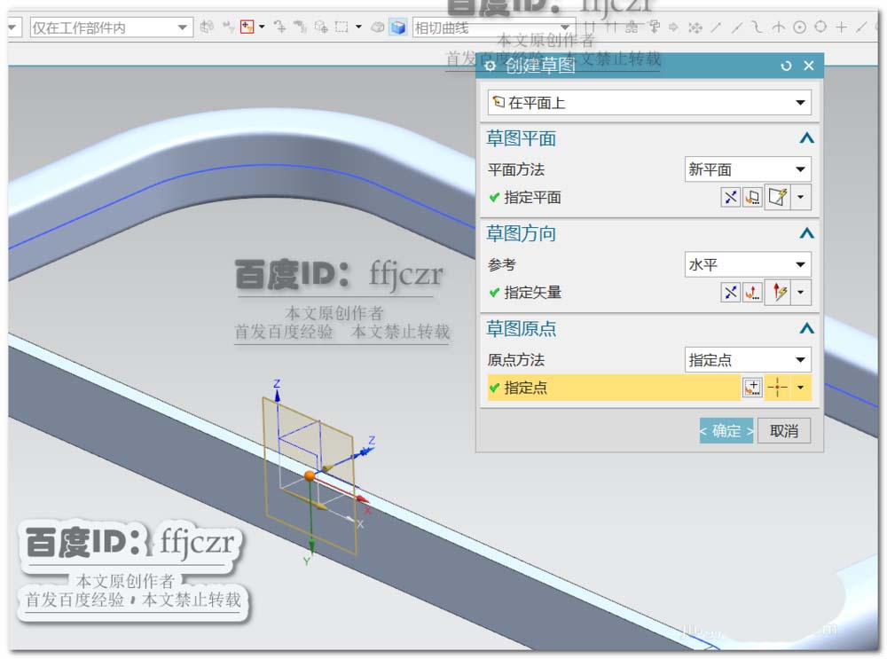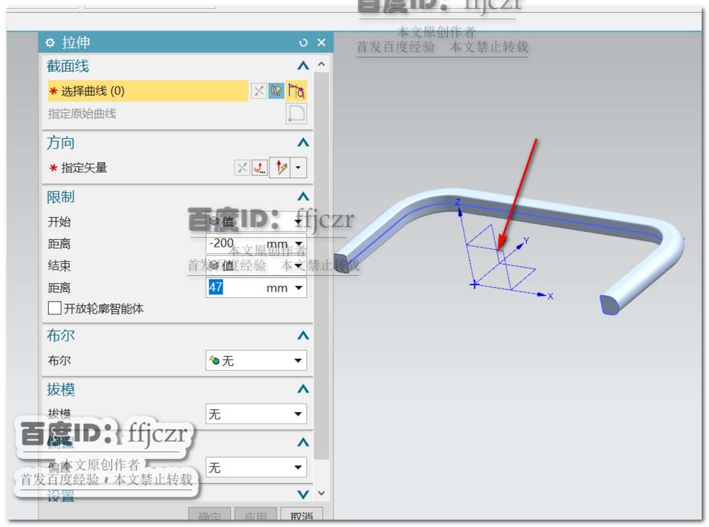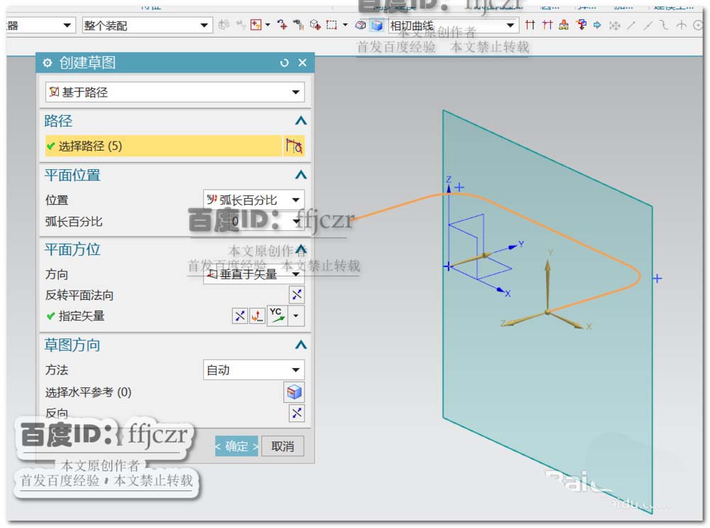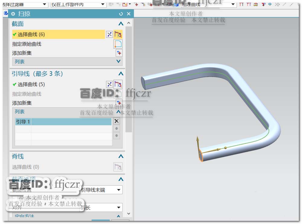 3、选用扫掠命令,截面线为上步绘得的草图,引导线为第一步绘得的草图。