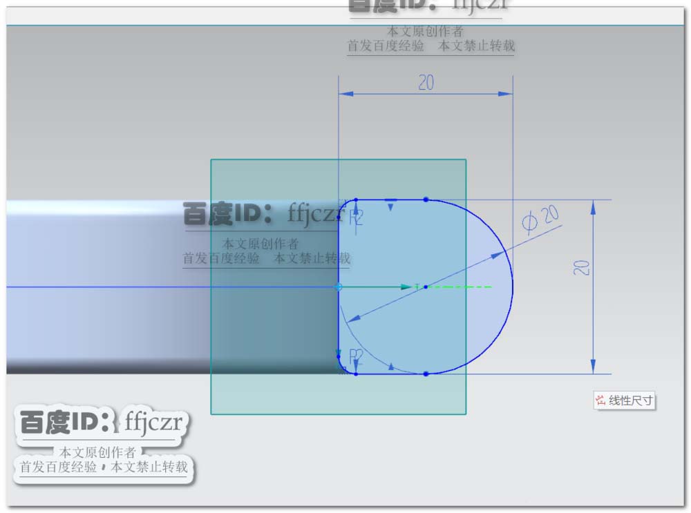 2、选择创建基于路径的草图,路径为上步的草图,平面位置用弧长百分比,值为0;垂直于矢量为Y轴。在草绘绘长为20的正方形,正方形的左边与Y轴共线,且上下两边对称于横轴,右侧边倒完全圆角,其余两角倒半径为2的圆角。