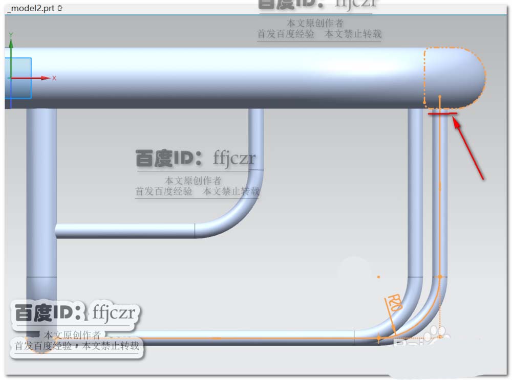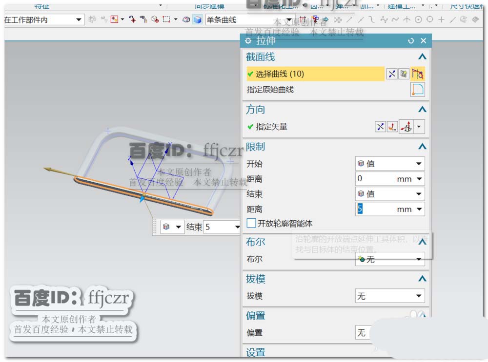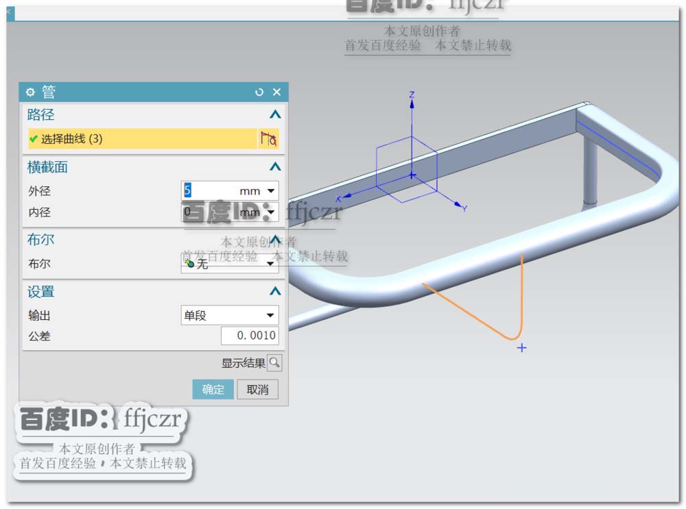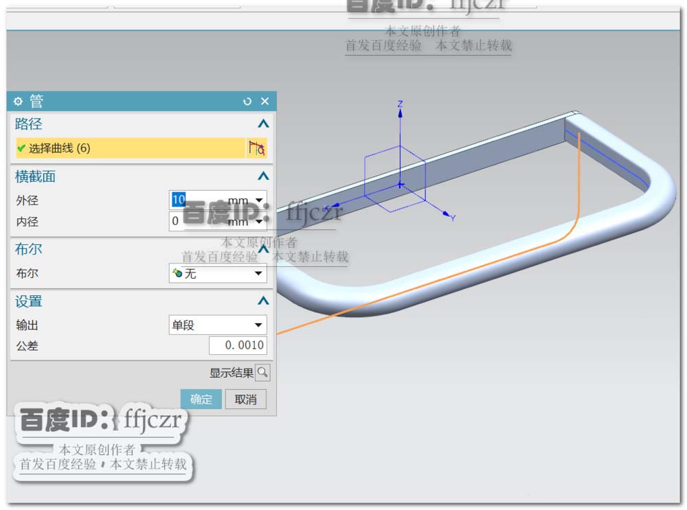 回到建模模式,选用管命令,路径为本次草绘所得的草图。外径为10,内径为0.