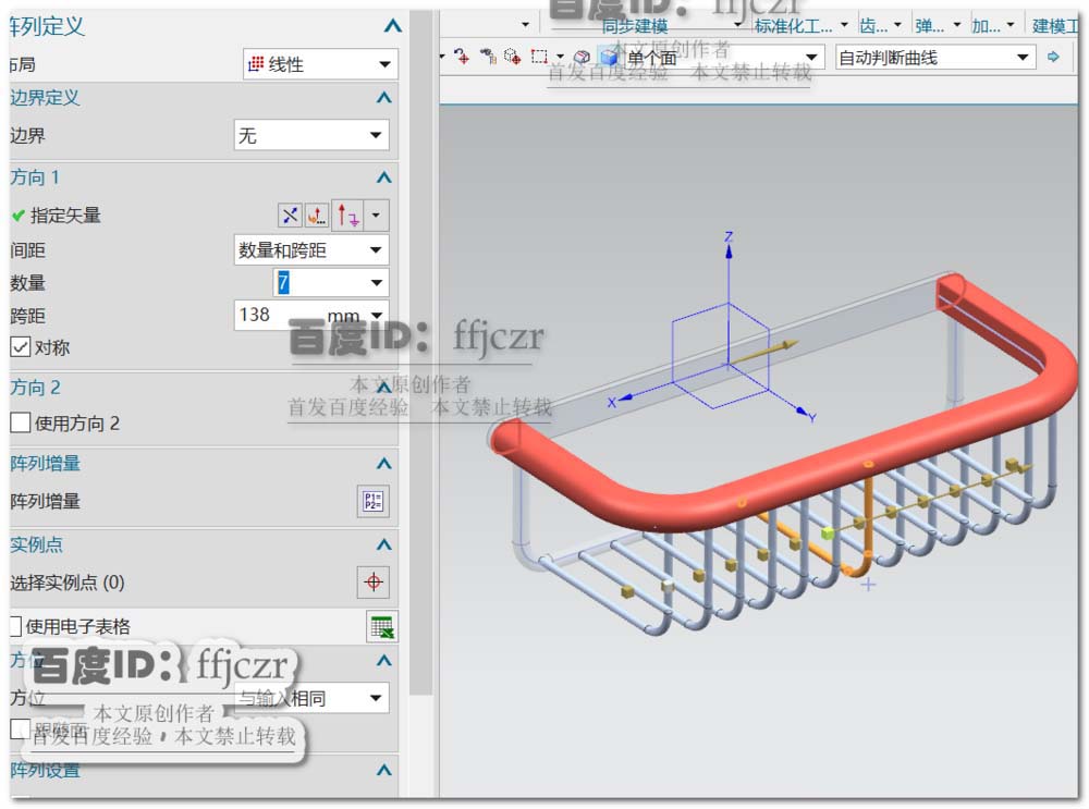 7、使用管命令,路径为上步所得草图;外径为5,内径为0。选用阵列几何体命令,对所得的管进行线性阵列,指定矢量为X轴,数量为7,跨距为138,勾选对称。