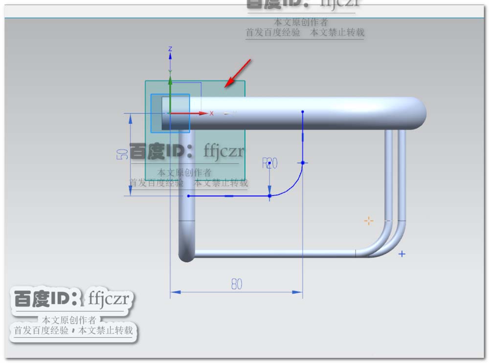 8、创建一个基准平面,以图示中箭头所指的圆柱中心处创建一个平行于YZ面的基准平面。以该基准平面为草绘平面,草绘中从左下方圆柱中心处绘一与X轴相距50的水平线;在X轴上绘一与Y轴相距80的竖线,两线相交处倒半径为20的圆角。