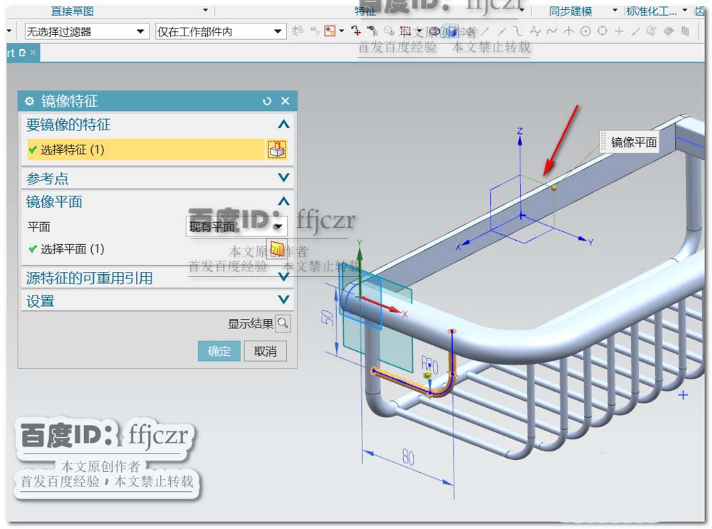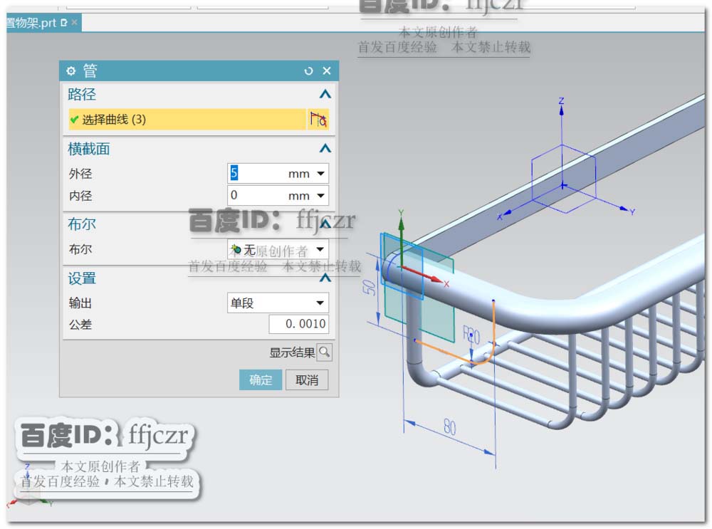 9、选用管命令,路径为上步所得的草图;管外径为5,内径为0。选用镜像几何体命令,以YZ面为镜像平面,使得另一面也得到相应的管结构。