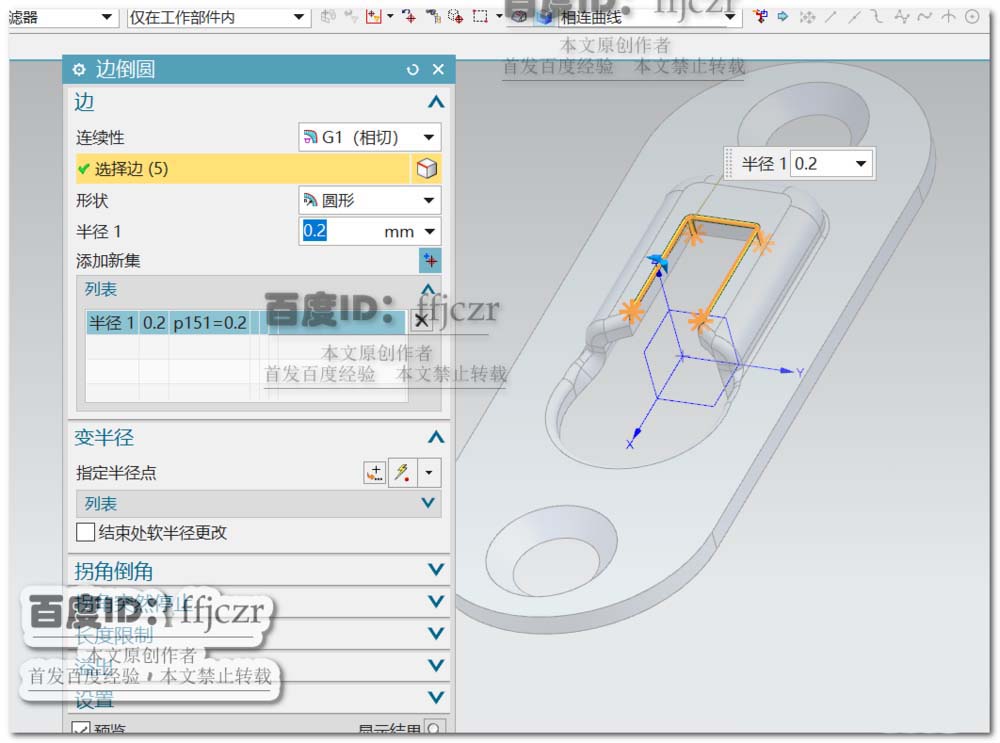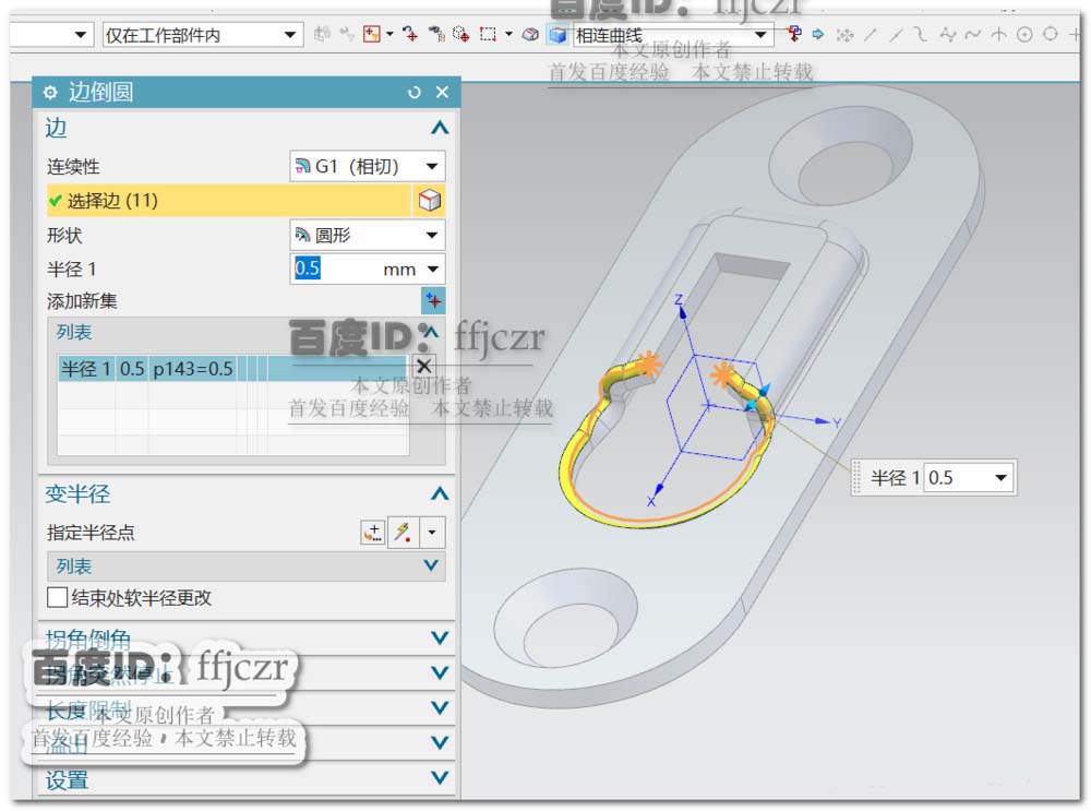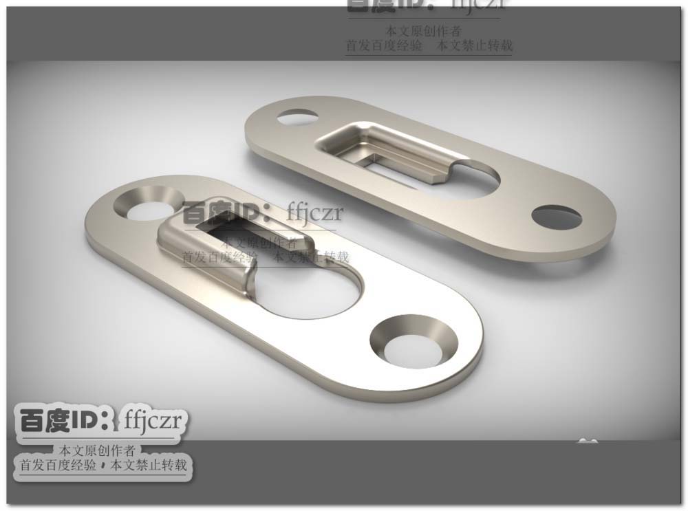 6、对五金件锐边的处理。转到建模模式,选用其中的倒圆角,对法向开孔与凹坑产生的相交锐边处倒半径为0.5的圆角,凹坑内部开孔处倒半径为0.2的圆角。挂片五金件模型创建完成。