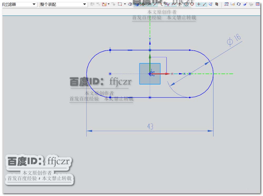 1、选择创建突出块,在其对话框中将厚度更改为1.2;以XY面为草绘平面,在草绘中用轮廓线绘出封闭的多边形线框,两端圆弧半径相等且圆心在X轴上,直径为16,最大距离为43.