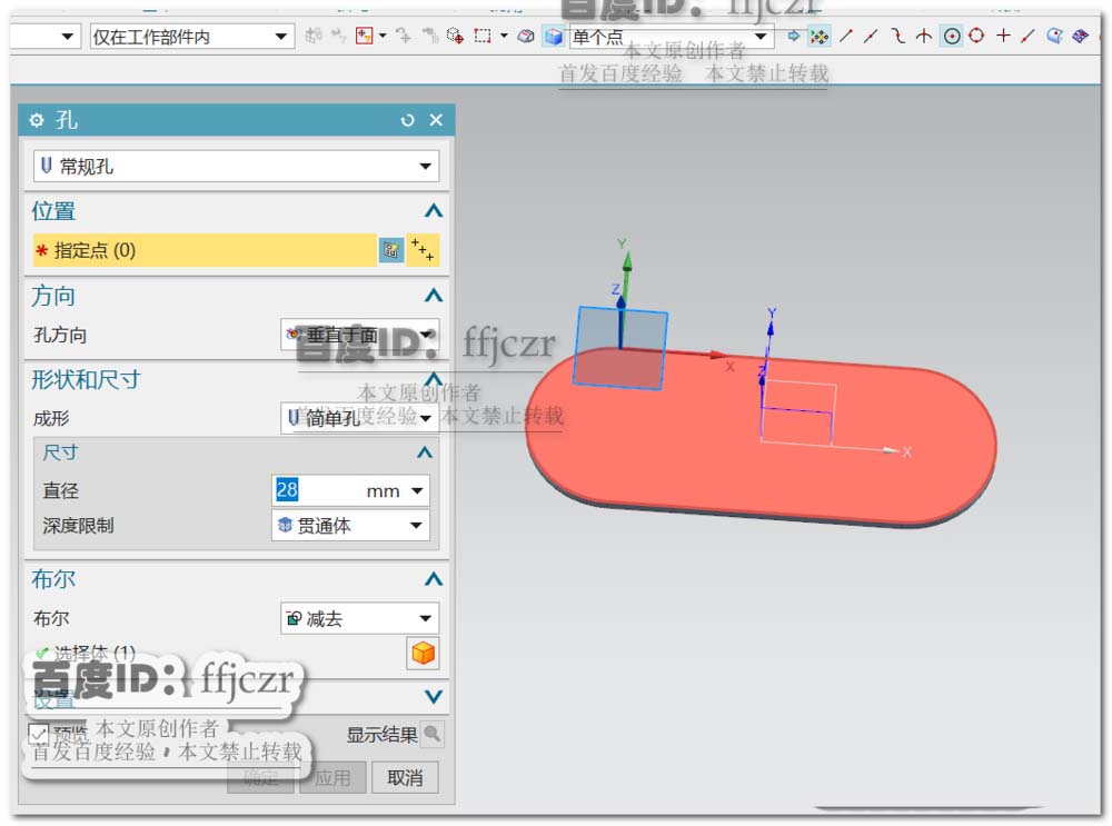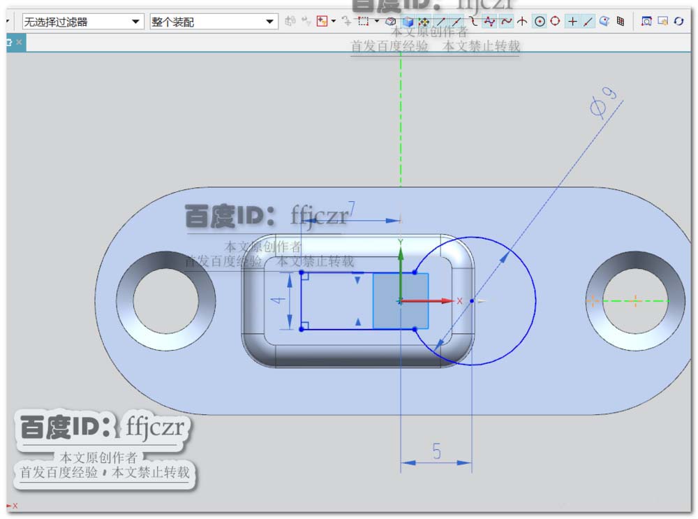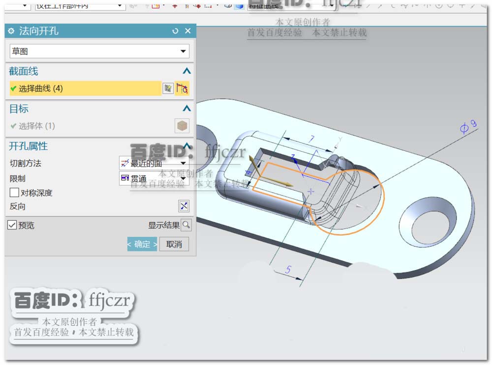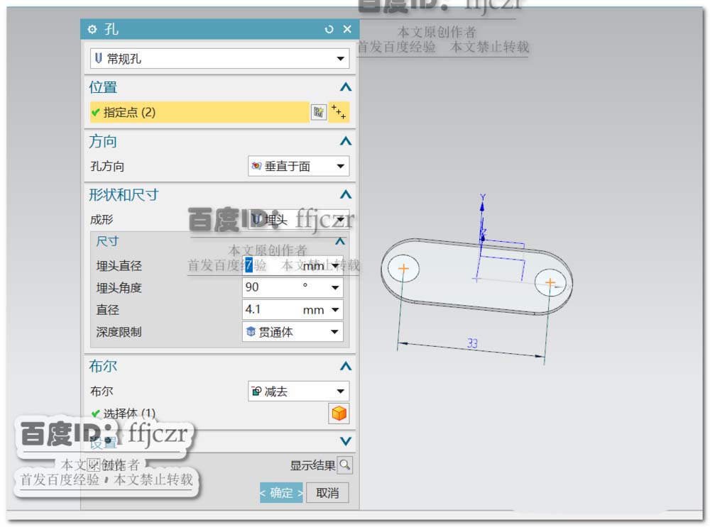 2、创建开孔,以突出块上表面为草绘平面,在草绘中创建二个定点,点在X轴上且对称于Y轴,两点间距为33。确定草绘定位点后,回到开孔对话框,选用成形为埋头,埋头直径为7,埋头角度为90。