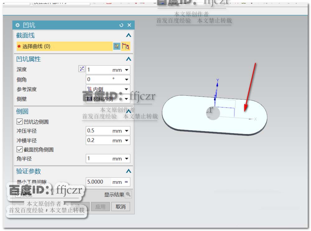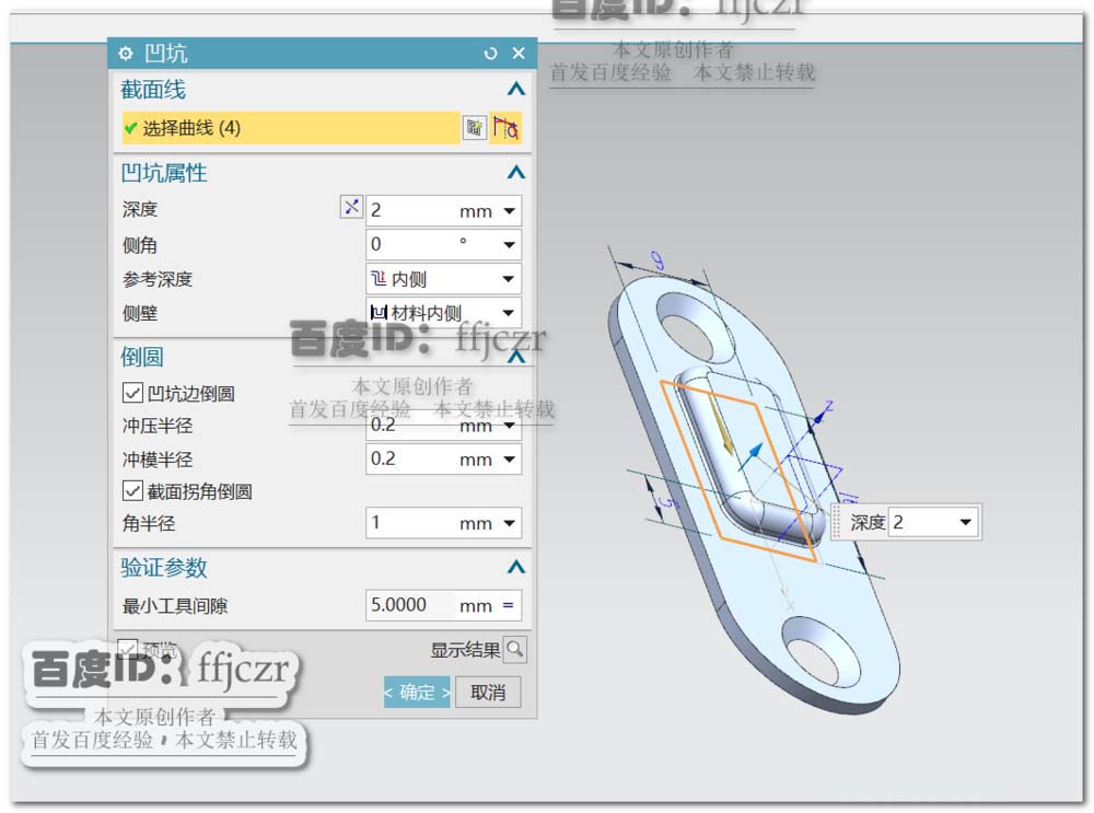 4、回到凹坑对话框,深度为2,勾选凹坑边倒圆,冲压半径为0.2,冲模半径为0.2,勾选截面拐角倒圆,角半径为1.