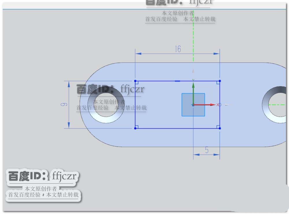 3、使用凹坑命令,以突出块的上表面为草绘平面;在草绘中绘出长为16,宽为9的矩形;矩形的宽平分于X轴,且右侧宽边与Y轴的距离为5.如图所示。