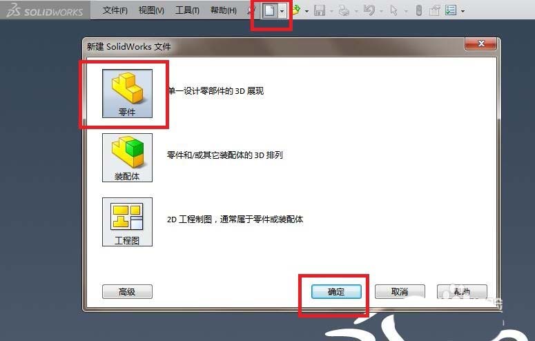 1、如下图所示,首先打开SolidWorks软件,然后点击标题栏中的“新建”图标,然后在弹出的对话框中选择“零件”并点击“确定”,至此,完成一个空白的SolidWorks零件文件的创建。