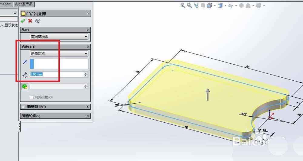 4、如下图所示,退出草图之后,来到了“拉伸”对话框,看着预览的效果,将对话框中的方向改成“两侧对称”,将拉伸高度设定为5,然后打√,完成砧板的主体创建。